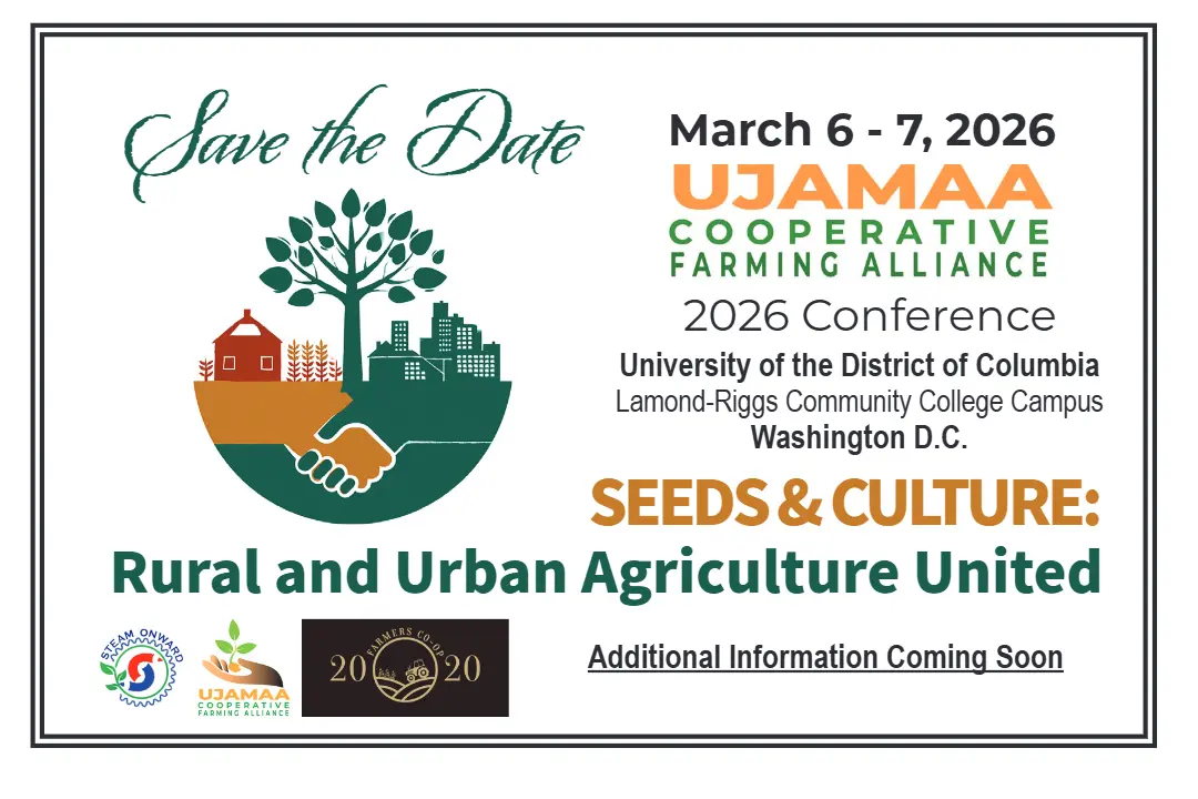 On March 6-7, 2026 the Ujamaa Cooperative Farming Alliance (UCFA) will host its 2026 conference “SEEDS & CULTURE: Rural and Urban Agriculture United” at the University of the District of Columbia (UDC)—in partnership with 2020 Farmers Co-op. The 2020 Farmers Co-op represents urban and rural growers and is committed to the preservation of traditional farming knowledge. The SEEDS & CULTURE conference is a uniquely powerful expression of UCFA’s mission to bridge communities across geographic and cultural lines through seed, soil, and shared knowledge.